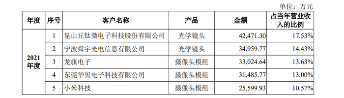 招股书显示,2021年诚瑞光学前五大客户分别为昆山丘钛微电子科技股份有限公司、宁波舜宇光电信息有限公司、龙旗电子、东莞华贝电子科技有限公司、小米科技。其中,小米科技占比为10.57%。