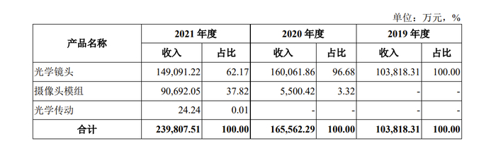 诚瑞光学主营业务收入构成分为光学镜头、光学镜头和光学传动。其中,光学镜头是收入主要部分,2019年-2021年营收分别为10.38亿元、16.01亿元、14.91亿元,占比分别为100%、96.68%、62.17%,逐年收窄。