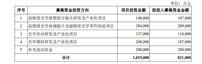 诚瑞光学此次拟募集资金82.10亿元,其中,10.7亿元用于高精度光学玻塑混合镜头研发及产业化项目;20.9亿元用于晶圆级光学玻璃镜片及超精密光学零件制造项目;11.8亿元用于光学传动研发及产业化项目;18.7亿元用于光学模组研发及产业化项目;20亿元用于补充流动资金。