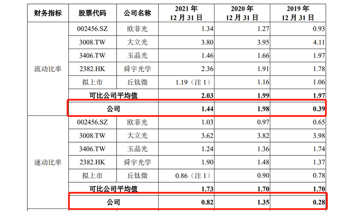 偿债能力指标方面,2019年至2021年,诚瑞光学的流动比率分别为0.39倍、1.98倍、1.44倍,同期同行业可比公司的平均值分别为1.97倍、1.99倍、2.03倍;另一数据,诚瑞光学的速动比率分别为0.28倍、1.35倍、0.82倍,同行业可比公司均值分别为1.7倍、1.7倍、1.73倍。报告期内诚瑞光学的流动比率、速动比率低于同行业可比公司的平均水平,诚瑞光学偿债能力不及同行。