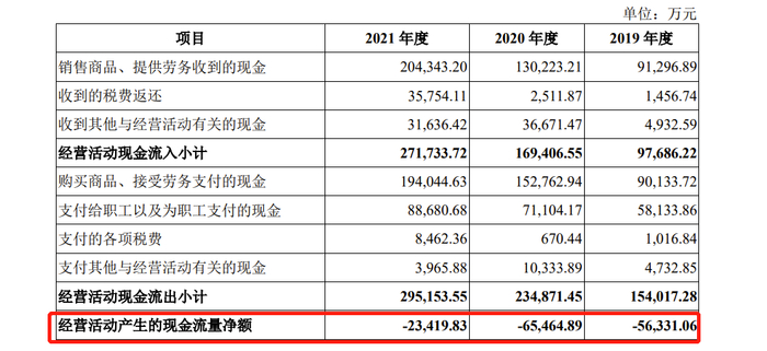 招股书显示,诚瑞光学经营活动产生的现金流量净额分别为-5.63亿元、-6.55亿元和-2.34亿元。