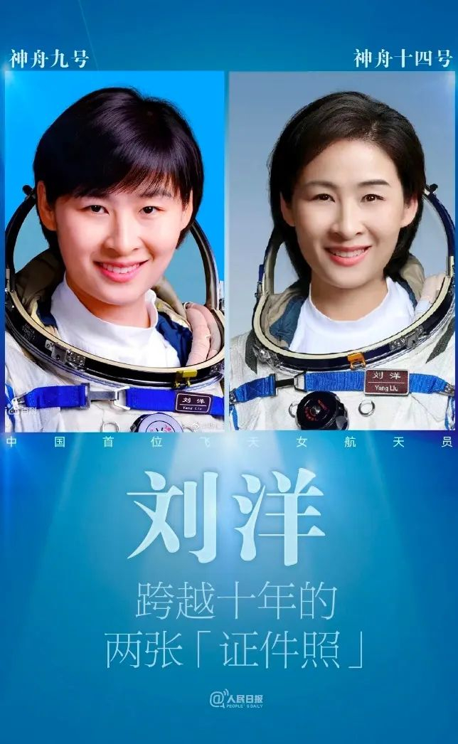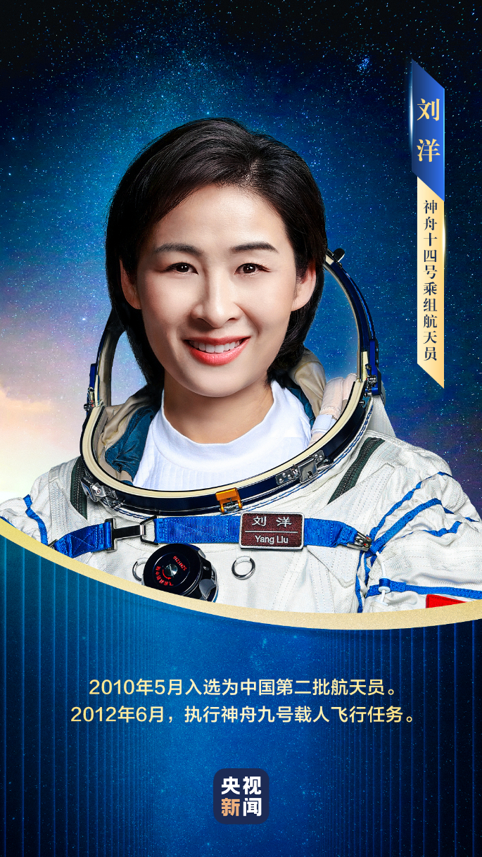 刘洋,女,汉族,中共党员,博士学位。1978年10月出生,1997年8月入伍,2001年5月加入中国共产党,现为中国人民解放军航天员大队特级航天员,大校军衔。曾任空军某师某团某飞行大队副大队长,被评为空军二级飞行员。2010年5月入选为我国第二批航天员。2012年6月,执行神舟九号载人飞行任务,同年10月,被中共中央、国务院、中央军委授予“英雄航天员”荣誉称号,并获“三级航天功勋奖章”。经全面考评,入选神舟十四号载人飞行任务乘组。2014-2018年就读于清华大学社会科学学院,获法学博士学位。