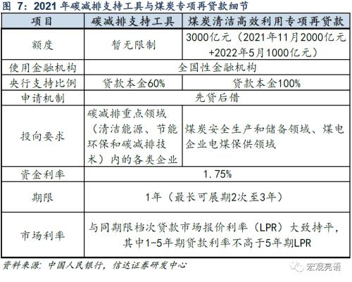 2)2021年:年初货币政策支持区域协调发展,央行对10个信贷增长缓慢省份增加再贷款额度2000亿元。9月增加3000亿元支小再贷款额度,支持地方法人银行增加小微企业和个体工商户贷款。11月8日央行正式推出碳减排支持工具,重点支持清洁能源、节能环保和碳减排技术三个碳减排领域,按照贷款本金60%给予支持。11月17日国常会明确在设立碳减排支持工具的基础上,再设立2000亿元支持煤炭清洁高效利用专项再贷款。2022年5月4日,为应对能源价格大幅波动等困局,央行明确在原2000亿元的基础上,新增1000亿元专项再贷款额度,专门用于支持煤炭开发使用和增强煤炭储备能力,保障能源稳定供应。2021年12月,央行下调支农支小再贷款利率0.25个百分点。