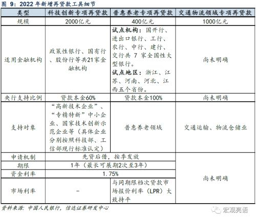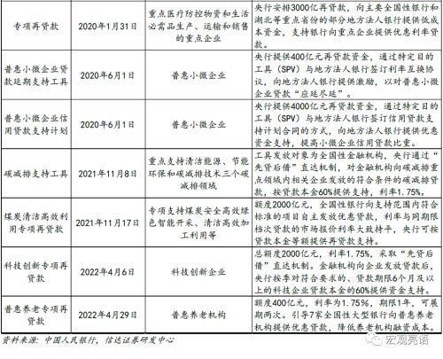 3)2022年:1月1日起,央行将两项直达实体经济的货币政策工具转换为支持小微企业的市场化工具,其中,“普惠小微企业贷款延期支持工具”转换为“普惠小微贷款支持工具”,人民银行对符合条件的地方法人银行发放的普惠小微贷款,按照余额增量的1%提供激励资金;“普惠小微企业信用贷款支持计划”并入“支农支小再贷款”管理,原来用于支持普惠小微信用贷款的4000亿元再贷款额度可以滚动使用。4月份以来,央行先后推出4400亿元再贷款工具,包括2000亿科技创新专项再贷款、400亿普惠养老专项再贷款、1000亿交通物流领域专项再贷款、增加1000亿元支持煤炭清洁高效利用专项再贷款额度。
