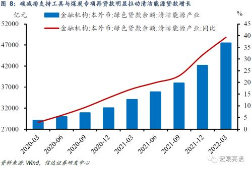 碳减排支持工具与专项再贷款明显拉动清洁能源贷款增长。两项工具推出后,2021年四季度清洁能源贷款余额明显增长,增速超30%。2022年一季度增速升至39.3%,单季新增5300亿元。根据央行货币政策司课题组5月初撰文《结构性货币政策工具精准出击 助力市场主体纾困和实体经济发展》,截至5月初,两项工具分别发放资金1386亿元、225亿元,支持金融机构发放贷款2310亿元、225亿元。