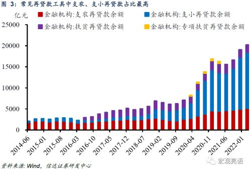 2)信贷政策支持再贷款。这一项与金融支持实体的联系最为紧密,常见的支小、支农、扶贫再贷款均属于其范畴。央行对于信贷政策支持再贷款实行“限额管理、余额监控”,期限分为3个月、6个月、1年三档,可做展期,支农支小再贷款最长期限可至3年,扶贫再贷款可至5年。相比MLF等常态化货币政策工具,信贷政策支持再贷款的资金利率明显更低。
