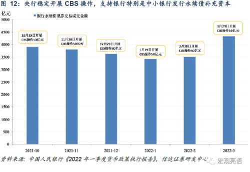 3)2019年初央行创设央行票据互换CBS工具,旨在提升银行永续债流动性,支持商业银行通过发行永续债补充资本。相比大型国有银行,中小银行补充资本压力更大,因此CBS工具实际上带有明显的结构性目的,重在帮助中小银行补充资本,可将更多信贷投向民营企业、中小微企业、“三农”领域等。2022年以来,央行稳定开展CBS操作,银行永续债现券成交额维持高位。