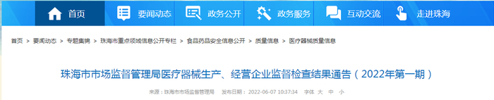广东珠海公布2022年医疗器械生产企业监督检查结果(1月-4月)