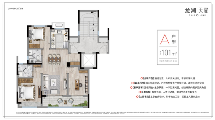 该户型整体南北通透,三开间朝南,超大阔景阳台,卫生间干湿分离,超大主卧,独立卫生间,很好的保证了私密性,
