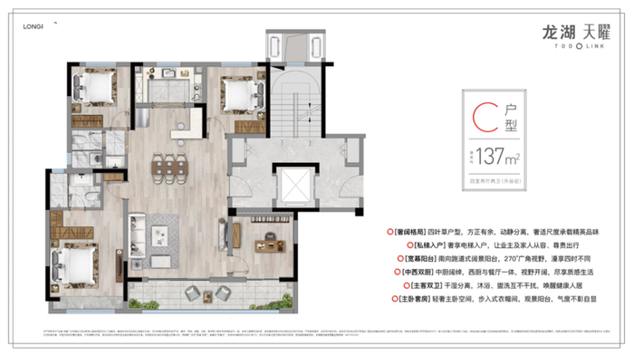 该户型整体方正,南北通透,270°阔景阳台,厨房餐厅一体化,超大主卧空间,尽享品质生活。