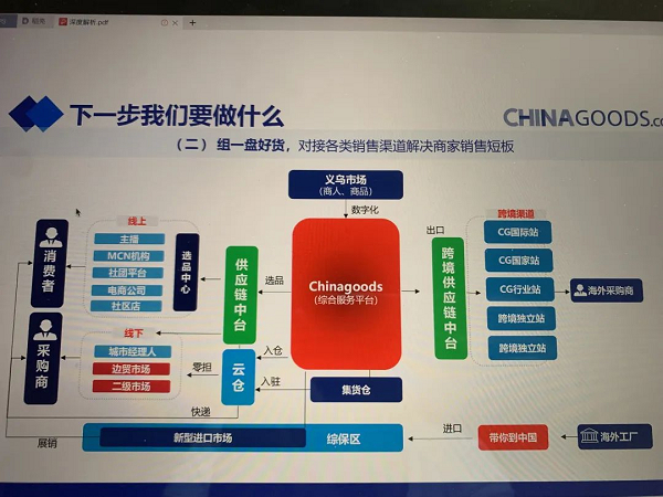 不仅如此,“采购宝”还与Chinagoods体系内的“环球义达”打通,提供义乌小商品城集团在国际物流、海外云仓、金融服务等方面的履约交付。目的是让市场采购贸易更高效、更经济,让商户结汇更快,让外贸内贸化,实现指尖上的外贸,让出口阳光化、税务阳光化、收汇阳光化,比传统模式更阳光透明。