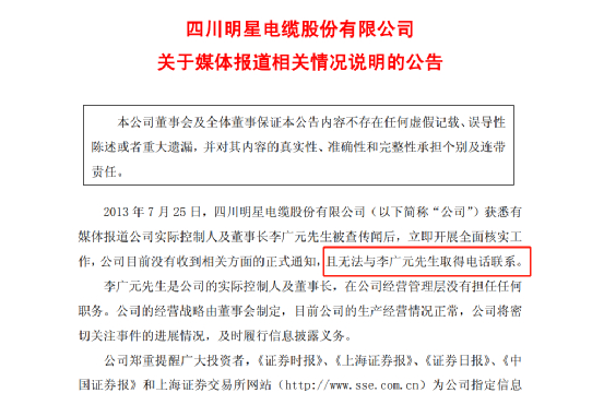 尚纬股份的前身明星电缆因在2013年卷入石油系统贪腐案,实控人李广元及多名高管一度失联。明星电缆在2013年7月公告称:“公司目前没有收到相关方面的正式通知,且无法与李广元取得电话联系”。9月份再发公告,“公司未能与董事、总经理沈卢东及董事、财务总监杨萍取得联系。”