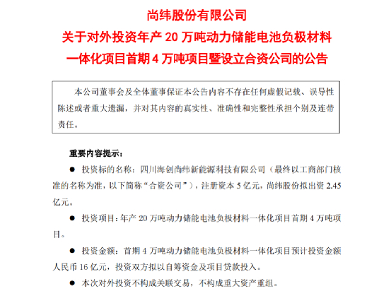 针对市场质疑,尚纬股份回应表示,公司跨界负极材料并非是讲故事,海螺创业看重尚纬股份所处的区域优势。西南地区具有水电优势,这是合作方看重的主要原因之一。目前合资公司已经成立,并组建了一个20余人的团队,目前相应环评工作和施工方案已经完成,计划5月开工。