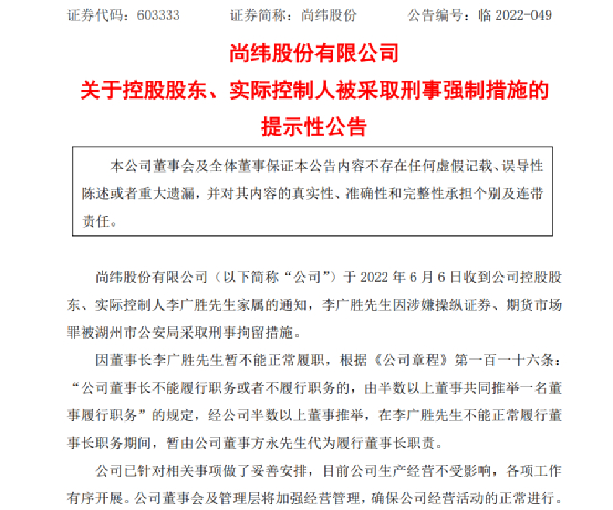 尚纬股份公告称,公司于2022年6月6日收到公司控股股东、实际控制人李广胜先生家属的通知,李广胜先生因涉嫌操纵证券、期货市场罪被湖州市公安局采取刑事拘留措施。