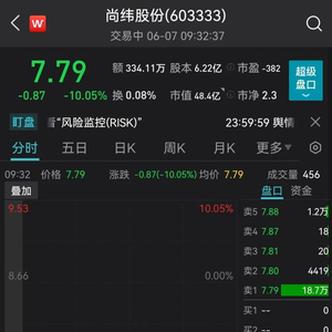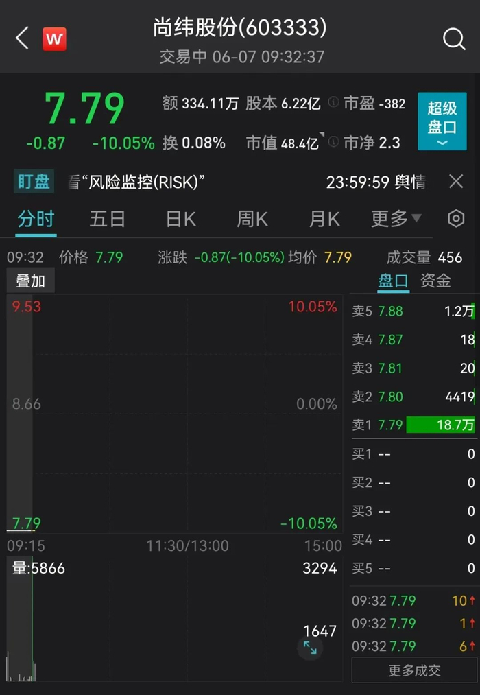今日开盘,尚纬股份跌停,封单超18万手。