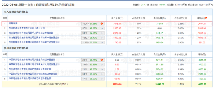 值得注意的是,据龙虎榜数据显示,昨日有1家机构专用席位现身,净买入2697.21万元。