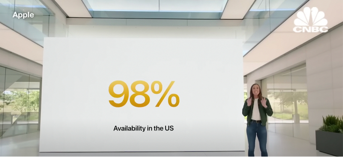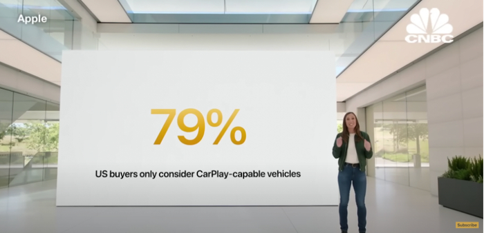 苹果在发布会上称,98%的美国车辆都可以适配CarPlay,同时调研显示,79%的美国消费者表示只购买支持CarPlay的车型。