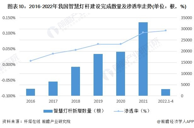 智慧灯杆渗透率=智慧灯杆当年新增已建数量/当年新增全国城市道路照明灯数量。
