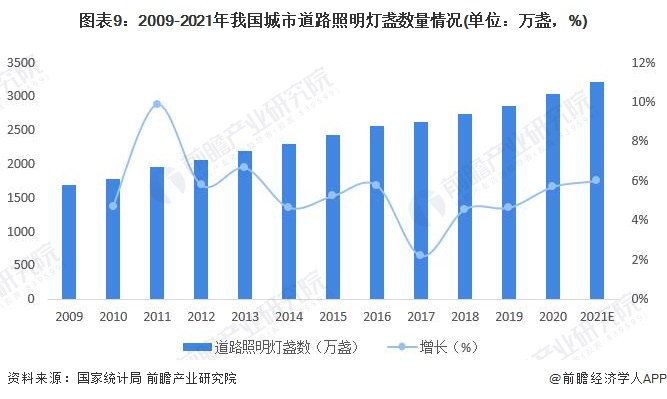 注:城市道路照明灯是指在城市道路设置的各种照明用灯,一根电杆上有几盏即计算几盏。截止2022年5月16日,国家统计局尚未公布2021年全国城市道路照明灯盏数,2021年数据为前瞻根据当年及往年情况进行的测算。