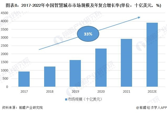 近五年来中国智慧城市市场规模年复合增长率达到33%。到2022年,中国智慧城市市场规模将达到近4万亿美元,城市智能化领域或迎来超级投资机会。智慧灯杆行业作为智慧城市关联度最大的行业之一,也迎来巨大的发展需求。