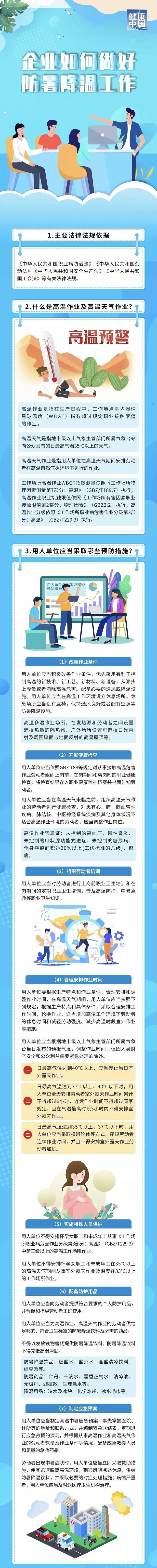 《指南》要求,切实落实防暑降温措施,合理安排工作岗位,对于不适合高温作业或高温天气作业的疫情防控人员要及时调整作业岗位。同时,科学安排作业时间,避免或减少高温时段作业,加强高温工作场所、高温天气户外疫情防控人员轮换休息,降低劳动强度、缩短一次连续作业时间(高温环境下缩短到2小时以内)。