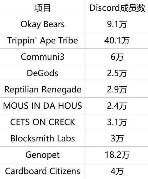 Solana链上头部NFT项目建立了庞大的社区,30天交易量排名前十位的项目中,Trippin’ Ape Tribe和Genopet的Discord成员数超过10万,前十位项目Discord成员数均在2万以上。