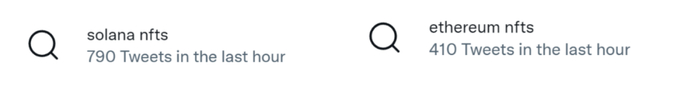 6月2日12:00的数据显示,1小时内包含solana nfts的推文数量为790条,而包含ethereum nfts的推文数量为410条,可见Solana NFT项目在推特上的讨论热度。