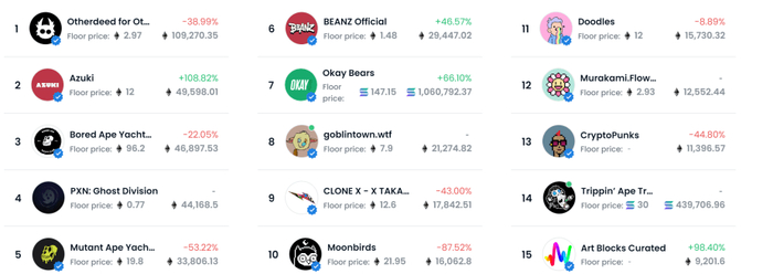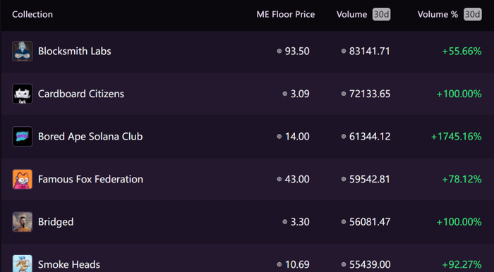 除了Okay Bears和Trippin’ Ape Tribe,头部Solana NFT的交易量在最近30天都迎来显著增长。