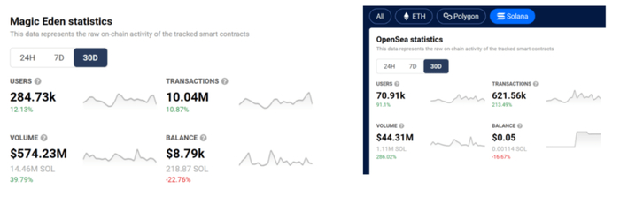 Magic Eden与OpenSea(以太坊链)交易量变化上的反差,反映在NFT市场整体低迷的情况下,Solana NFT市场热度不减反增。