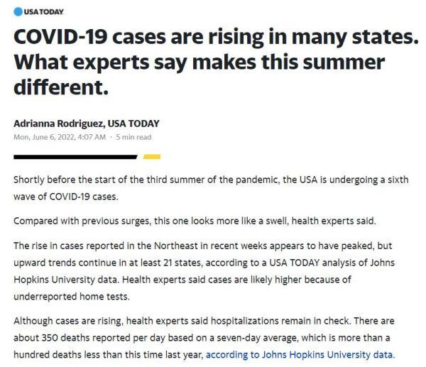 6月6日,《今日美国报》刊发报道称,在大流行的第三个夏天开始前不久,美国正在经历第六波疫情。尽管病例在上升,但健康专家表示,住院人数仍在控制之中。根据7 天的平均值,目前美国大约每天报告死亡350 人,比去年同期减少了 100 多人。这一数据正是援引自约翰·霍普金斯大学。