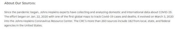 网站上还有这么一段介绍:自大流行开始以来,约翰·霍普金斯大学的专家一直在收集和分析有关疫情的国内和国际数据。这项工作于2020 年1 月22日开始,是首批追踪新冠病例和死亡人数的全球地图之一。它于2020年3月3日演变为约翰·霍普金斯新冠资源中心(CRC)。CRC的260 多个来源中,182个来自美国地方、州和联邦机构。