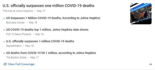 从谷歌新闻上搜索,并没有找到这样的消息,倒是在5月17日和18日,包括《商业内幕》《波士顿环球报》在内的多家美国媒体报道了美国疫情死亡人数突破100万的消息,而消息源引用的正是约翰·霍普金斯大学的统计数据。