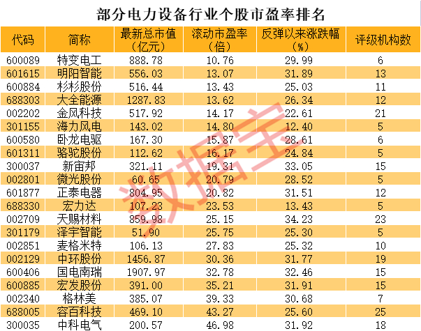 数据宝统计,5家以上机构评级的电力设备行业个股中,有21股4月27日以来股价涨幅低于行业涨幅且最新滚动市盈率低于50倍。其中,宏力达和海力风电两只个股涨幅不足15%,骆驼股份、金风科技、宁德时代等个股涨幅不足25%。从市盈率角度来看,特变电工、明阳智能、杉杉股份、大全能源等个股市盈率均低于15倍。(数据宝 陈见南)