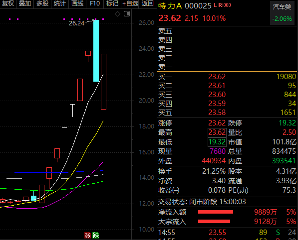 承接昨日弱势,今天早盘特力A以跌停价开盘,连续竞价交易后便直线拉升,上午10点16分左右即封上涨停;1个小时后打开涨停板,持续震荡尾盘再度封上涨停,上演地天板行情。而这只个股昨天也才刚上演天地板行情,令人瞠目结舌的是,在昨天的天地板行情之前,特力A曾一度走出连续7个涨停板。