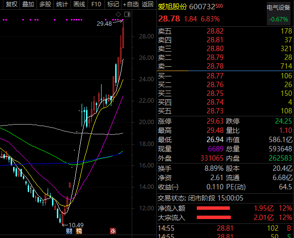 部分龙头品种本轮反弹已创历史新高。其中,锂矿二线龙头中矿资源于今日突破今年3月份的历史高点,光伏二线龙头爱旭股份连续几天股价创历史新高。本轮反弹爱旭股份从低点10元上方涨到今天最高近30元,最大涨幅超过181%。中矿资源本轮反弹最大涨幅超过84%。