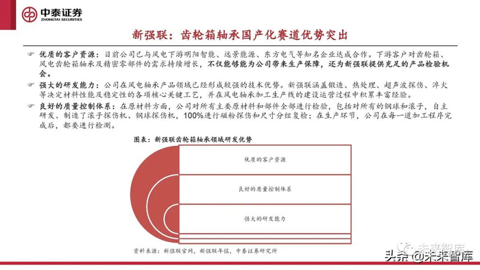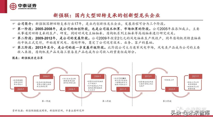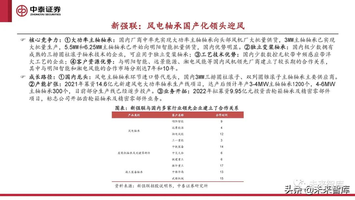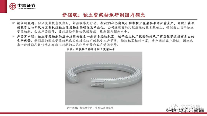 技术研发端:独立变桨概念提出后,新强联率先行动,在2021年已实现小功率独立变桨轴承的批量生产,目前正在积 极投资大功率风力发电机组独立变桨轴承的研发及产业化。公司在现有的比较成熟的技术基础上,研制出大功率独立 变桨轴承,已完产品设计,目前正处于样机试制阶段,达到国内领先水平。