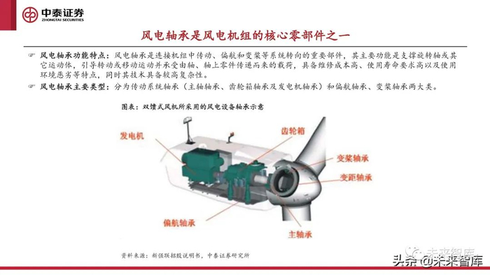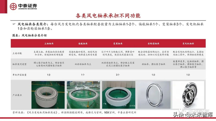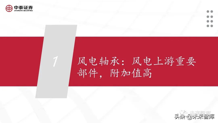 下游方向:根据电气风电招股说明书披露的数据,风电轴承占其风力发电机组的成本约为8%。比较风力发电机各主要 零部件的龙头厂商,风电轴承的整体毛利率约为30%,主轴轴承毛利率则高达40%,为高附加值环节。