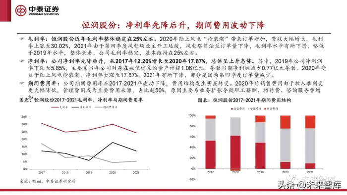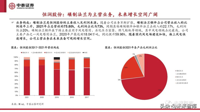 业务构成:碾制法兰是恒润股份的主要收入及利润来源。随着公司业务不断扩张,碾制法兰锻件占公司营业收入的比 例逐年上升,2021年占总营收的75.80%,毛利润占比为73%,同期其他碾制锻件和锻件法兰占收入的22.17%,毛利润 仅占20%。碾制法兰锻件在下游主要应用于风电塔筒、石化压力容器、燃气轮机等领域,其中风电领域占比最高,公司 主要产品之一风电塔筒法兰,2020年产能达到18.04万吨,同比提升59.96%,随着国内风电场建设加快,海上风电快 速增长,公司主营业务在未来具备可观的增长空间。