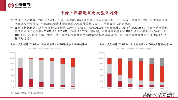 平价上网大时代:2021年1月1日开始,新核准的陆上风电项目全面实现平价上网,国家不再补贴,2022年中国海上风 电也进入平价时代。补贴退坡使降本增效成为风电发展的核心方向,风机大型化加速推进。