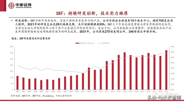 研发创新:SKF不断开发新技术,为客户提供更有竞争力的产品。公司目前在全球设有15个技术中心,拥有700名应用 工程师,2021年的研发支出达28亿瑞典克朗,且计划继续提高50%。SKF几十年来还高度重视与学术界保持深度合作, 目前与全球大学的科技中心有十余个正在进行中的合作项目。受益于此,公司在轴承以及摩擦学、传感器技术和产品 生命周期等轴承相关领域都有诸多的研发成果。2021年,公司实现275项发明公开,246项首次申请专利。