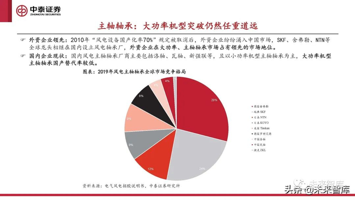 外资企业领先:2010年“风电设备国产化率70%”规定被取消后,外资企业纷纷涌入中国市场,SKF、舍弗勒、NTN等 全球龙头相继在国内设立风电轴承厂,外资企业在大功率、主轴轴承市场占有领先的市场地位。