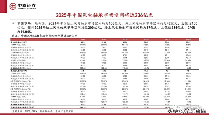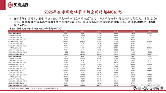 全球市场:经测算,2021年全球陆上风电轴承市场空间约为227亿元,海上风电轴承市场空间约为70亿元,总值近300 亿元。预计2025年陆上风电轴承市场空间约为350亿元,海上风电轴承市场空间约为93亿元,总值超440亿元,CAGR 为10.42%。(报告来源:未来智库)