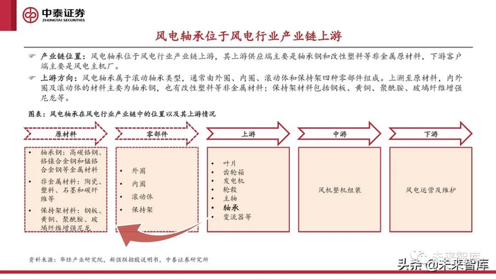 产业链位置:风电轴承位于风电行业产业链上游,其上游供应端主要是轴承钢和改性塑料等非金属原材料,下游客户 端主要是风电主机厂。
