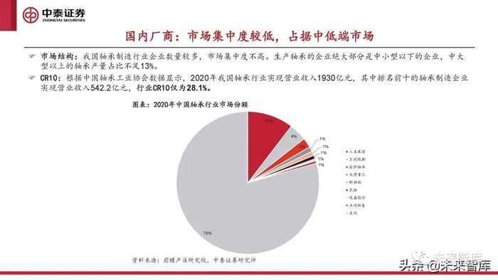 CR10:根据中国轴承工业协会数据显示,2020年我国轴承行业实现营业收入1930亿元,其中排名前十的轴承制造企业 实现营业收入542.2亿元,行业CR10仅为28.1%。