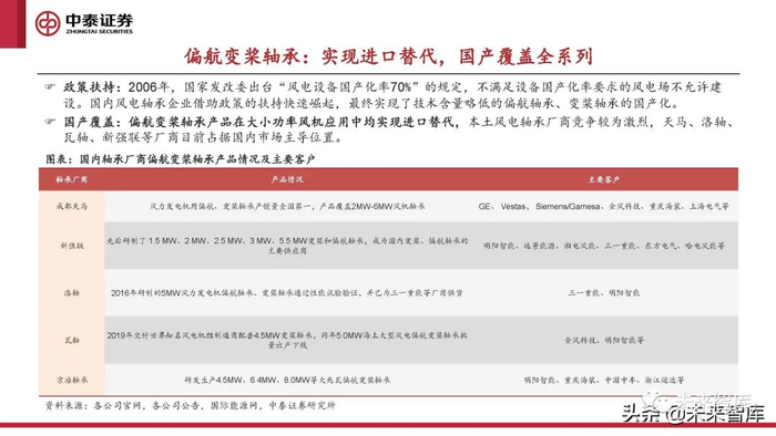 政策扶持:2006年,国家发改委出台“风电设备国产化率70%”的规定,不满足设备国产化率要求的风电场不允许建 设。国内风电轴承企业借助政策的扶持快速崛起,最终实现了技术含量略低的偏航轴承、变桨轴承的国产化。
