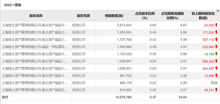 随后的三季度,南土资产的5只产品再度加码博众精工,包揽博众精工前四大流通股东,南方科创板混合基金和博鸿资产旗下私募产品则新进为博众精工十大流通股东。不过经过三季度博众精工的大幅上涨,四季度其他公私募产品选择撤退,南土资产却不“恐高”,继续加仓,2021年底便包揽了公司前十大流通股东。在今年一季度博众精工大幅回调的过程中,南土资产继续加仓。