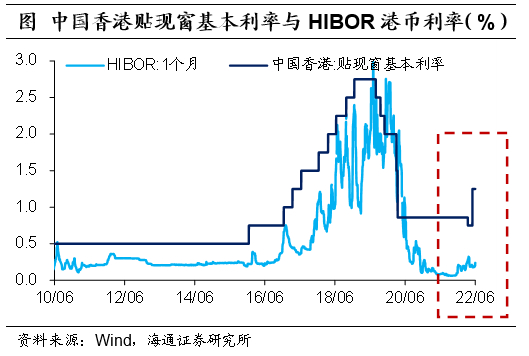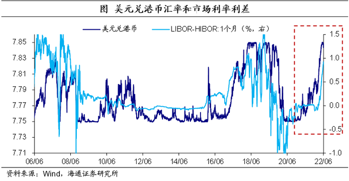 港币贬值主因二:美元加息周期下,港币和美元利差扩大。从历史数据来看,美元兑港币的汇率走势与二者利差高度相关。这其实也很容易理解,由于资本可以自由流动,当美元利率相比港币利率走高时,资本可以通过借入港币兑换成美元来实现套利,促使港币贬值压力加大;反之,则可能促使港币升值。今年以来,在美元加息周期背景下,1月期LIBOR美元利率持续上行,与1月期HIBOR港币利率之间的差距从0BP附近,不断扩大至当前接近90BP。这也是港币兑美元持续贬值的关键原因。