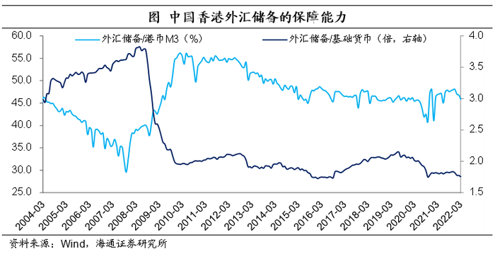 另一方面,中国香港金管局目前也有能力维持汇率稳定。在联系汇率制度下,一旦港币再度贬值至弱方兑换保证水平,中国香港金管局将继续向银行买入港币、投放美元,来维持汇率的稳定。根据中国香港金管局最新公布数据,截至4月,官方外汇储备资产为4657亿美元,仍在历史高位,相当于中国香港流通货币约6倍多,也相当于港币供应量M3的44%。足够多的外汇储备,就是港币汇率稳定的重要保障。