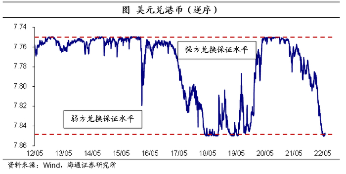考虑到美国当前处于加息周期中,而美国通胀压力依然较大,美联储仍需收紧货币政策。截至6月3日,CME跟踪数据显示,市场预期美联储全年加息11次的概率回升至7成以上,其中6月和7月分别加息50BP,9月加息50BP的概率也超7成。加之,欧洲经济已经陷入滞胀状态,欧洲和日本的货币政策又仍在持续宽松中,我们认为,美元仍可能维持强势。而在美元强势背景下,港币仍有贬值压力。
