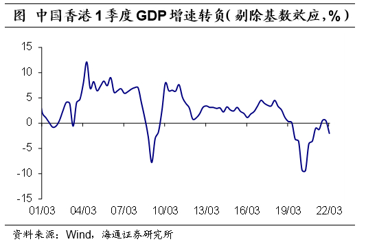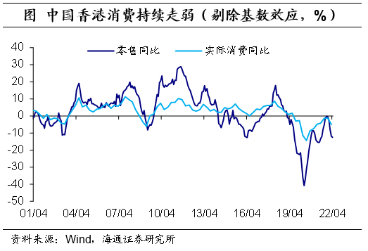 港币贬值主因一:经济基本面有所走弱。中国香港的经济、资金流动和内地的相关性是比较高的。从去年以来,内地经济基本面从高位逐步回落,今年以来又受到疫情的影响,短期受到冲击较大。从中国香港自身经济来看,剔除基数影响后,1季度中国香港实际GDP增速转负,为去年2季度以来首次。尤其是占经济总量超6成的消费较为疲弱,剔除基数效应后,消费同比跌幅持续扩大。截至4月,失业率也上行至5.4%,为2021年6月以来新高。